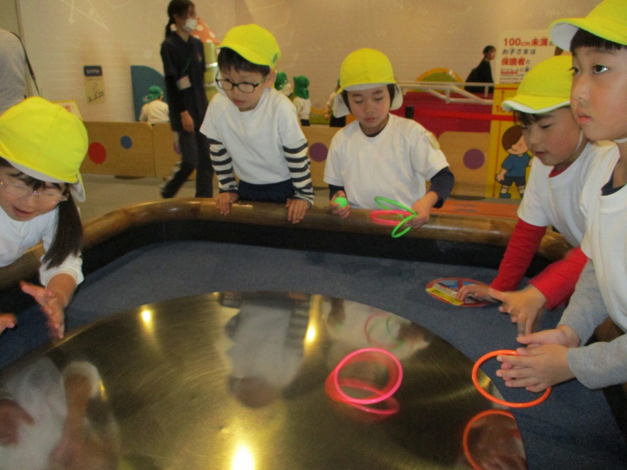 4・5歳児がお別れ遠足でキッズプラザに行きました。5歳児にとってはこども園最後の遠足。クラスごとにバスに乗り、ウキウキの子どもたち。バスの中ではクイズをしたり、歌を歌ったり、キッズプラザってどんな所?と話しながらワクワクして向かいました。キッズプラザに到着すると、様々な不思議なからくりがお出迎えしてくれ、「わぁ~!」と目をいっぱいキラキラさせて、シャボン玉の不思議や遊びの広場に夢中になって楽しむ子どもたちでした。いろんな体験を楽しんだ後は、朝からお家の人が作ってくれたおにぎり弁当を「おいしいね~」「から揚げ入ってるねん」と喜んで食べ、また、みんなで遊びの探検を満喫しました。途中、休憩でおやつタイムもしてほっこり。帰りのバスはぐっすりお休みタイムの子どもたちでした。