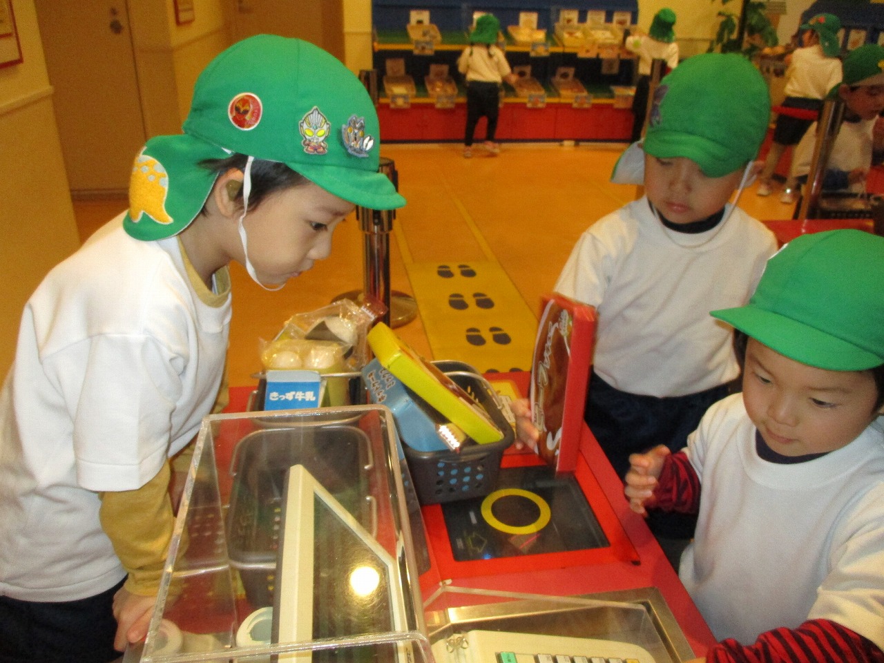 お買い物ごっこのコーナーでは自分の好きなお買い物を3つまで買うことができ、自分でレジを通し、レシートまでお土産でもらえ、楽しむ4歳児の子どもたちです。