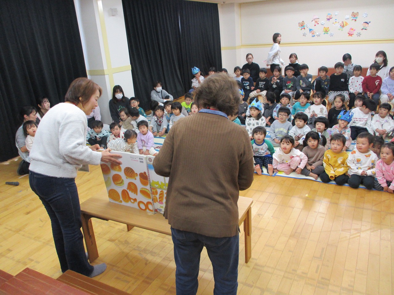 2月生まれのお友だちの誕生日をみんなでお祝いしました。誕生児のお友だちはドキドキしながら舞台に上がり、かっこよく自己紹介してくれました。聞いているおともだちも「へぇ~一緒だ!」「かっこいいね~」とお祝いの嬉しい気持ちで聞き拍手を送ってくれていました。みんなで、歌を歌ったり、「おめでとう」とお祝いの言葉を言ってくれたり、クイズで考えたり催しを見たりして楽しみました。最後は1歳児あひる組さんのかわいいダンスを見てみんなで喜びました。