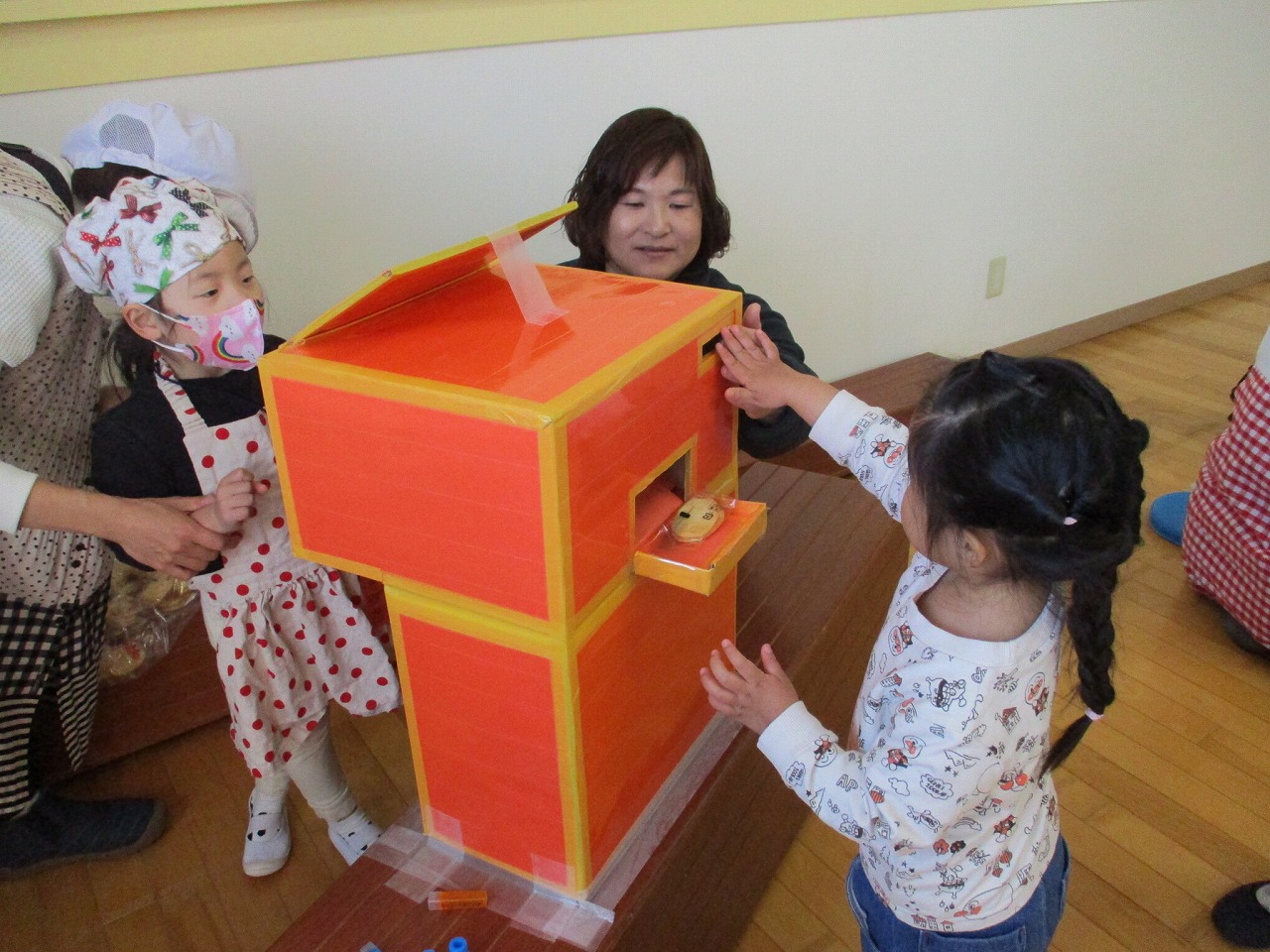 レストランごっこの第一部は3歳児ばら組さんがお店屋さんになって、0歳児のひよこ組さんと1歳児のあひる組さん2歳児のこあら組さんがお客さんになり、買いに来てくれレストランオープンです。ばら組さんは威勢よく「いらっしゃいませー」「おやつ屋さんですよ~」とチケットをわたし、「お菓子ください」と言われると「チケットをここに入れてください」と説明して自動販売機からお菓子を流します。お菓子をもらったお客さんの子どもたちはにっこり。みんなで嬉しそうに食べていましたよ。