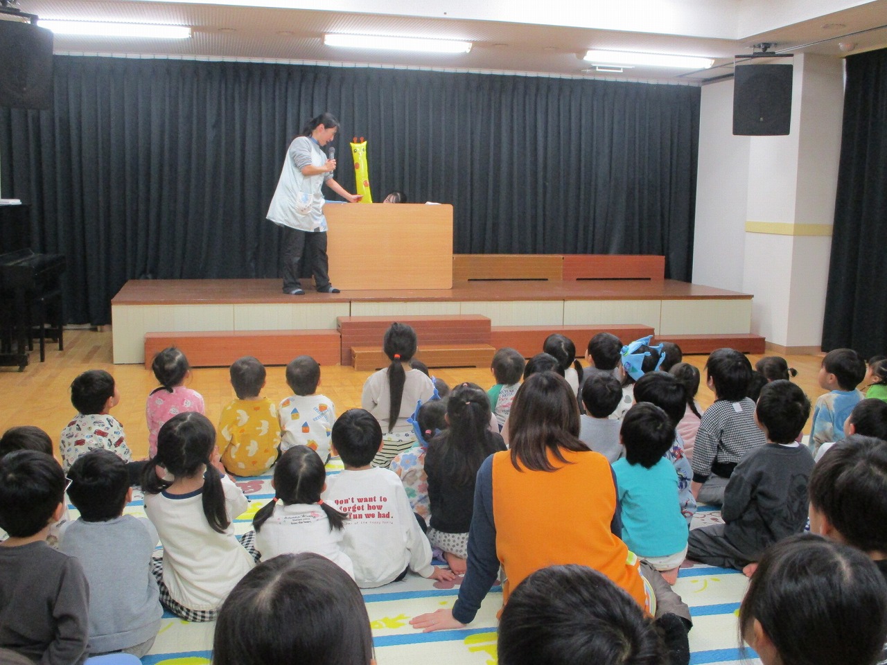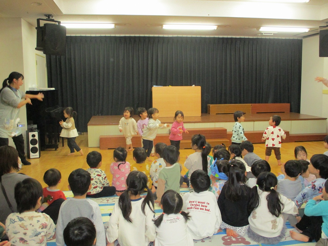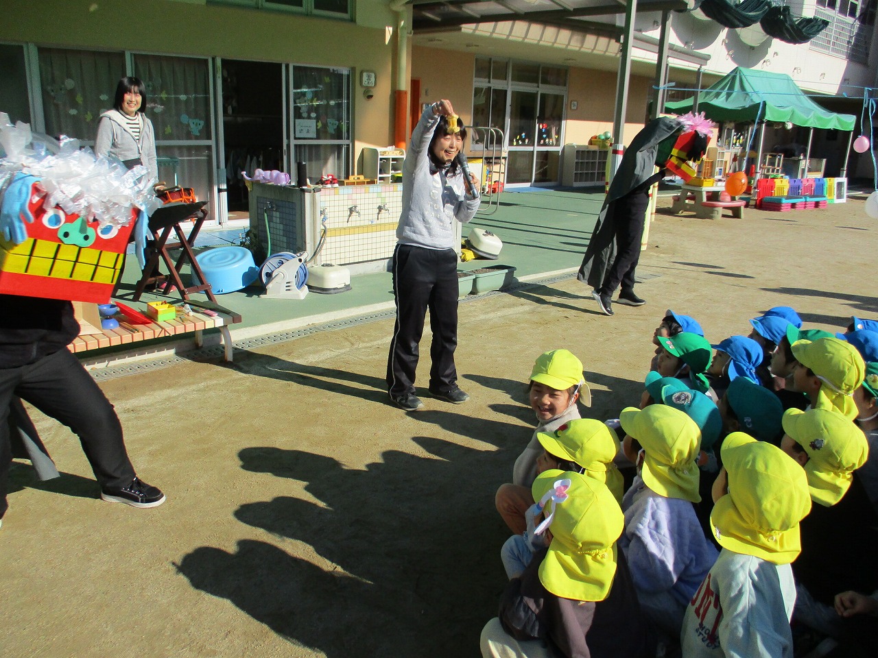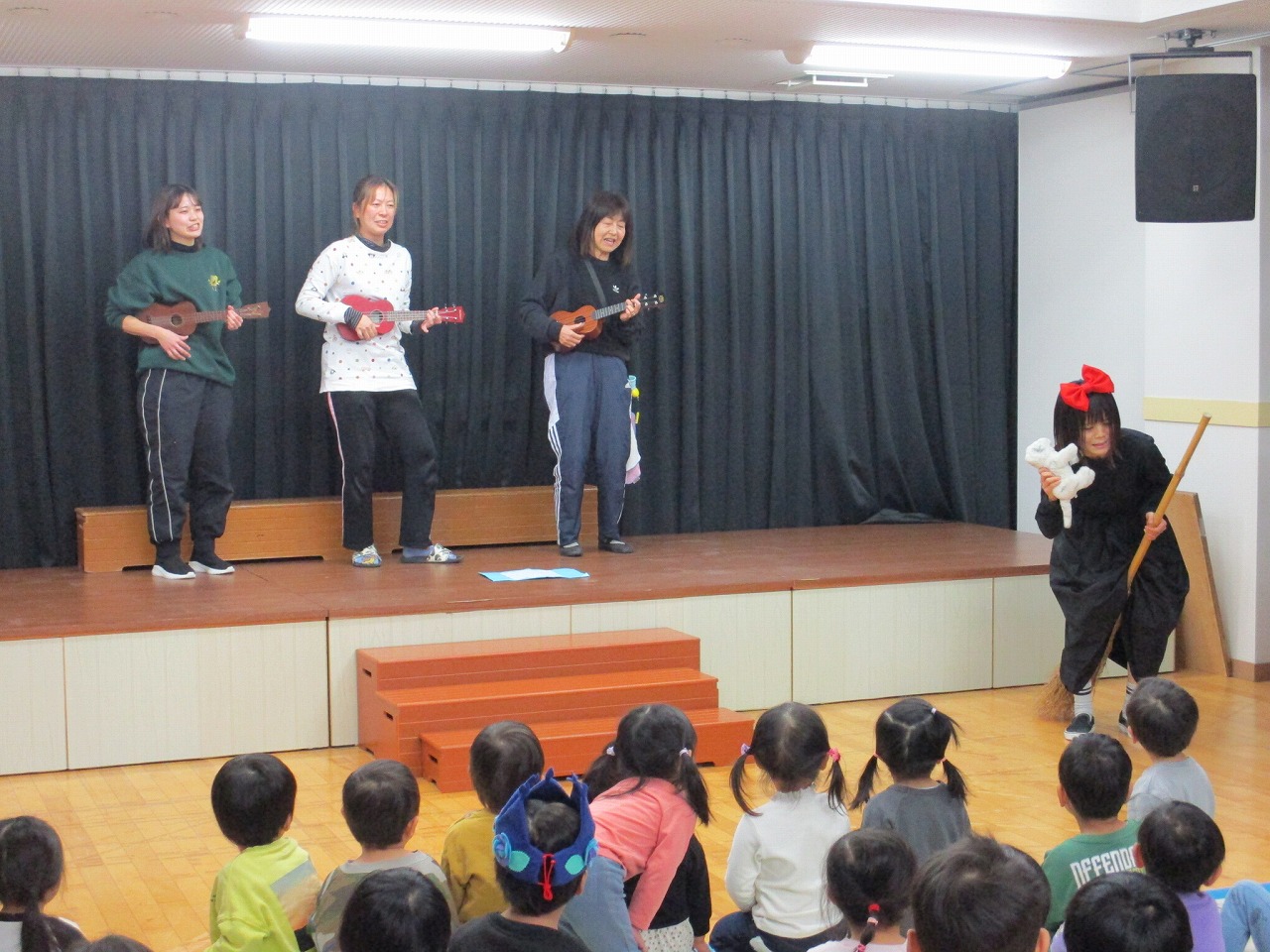 先生3人のウクレレの演奏に合わせて魔女の宅急便のキキがほうきにまたがって飛び回ったり、2歳児クラスの子どもたちが手遊び歌「おふろやさんにいこう」を披露してくれたりしました。
