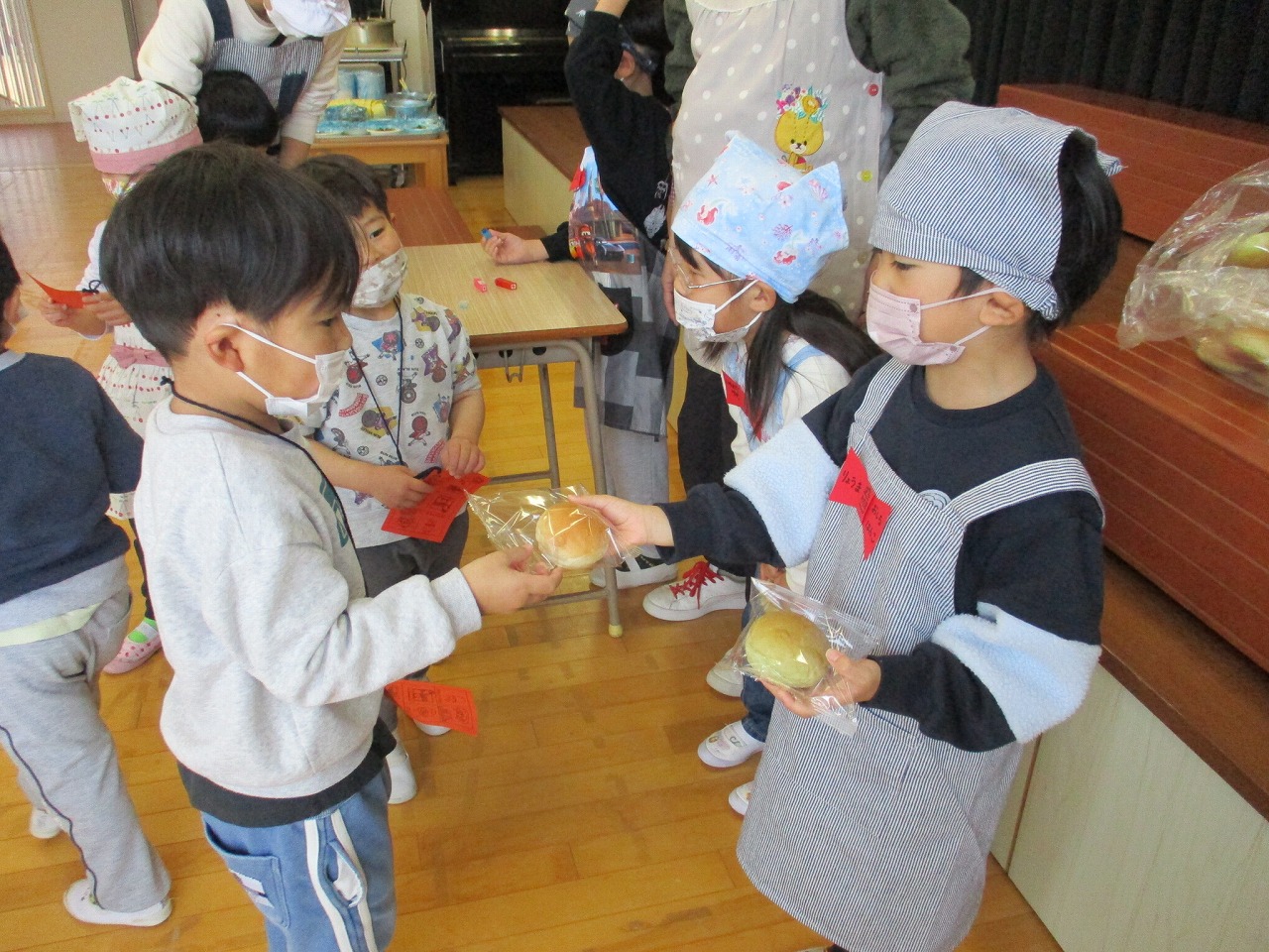 最後の仕上げは給食室で調理の先生にお願いして、さぁ!第2部の3・4・5歳児のレストランがオープンです。第2部は4歳児がフランクフルト屋さんとおやつ屋さんのお店屋さんとお客さんに分かれ、5歳児がおかず屋さんとパン屋さんのお店屋さんとお客さんに分かれます。3歳児はお客さんです。お客さんは全部のお店を回れるようスタンプを押してもらいます。「いらっしゃいませー」とお店屋さんの元気な声が響き、「フランクフルトください」「ケチャップはつけますか?」「ケチャップいりません」「ケチャップは多めでお願いします」等などそれぞれ考えてやり取りを楽しみレストランのおかずが並んでいきます。スタンプを押したり「スタンプ全部つけてもらった」と喜んだりしてみんなが揃ったところで「いただきまーす!」とみんな、嬉しそうに満足いっぱいで食べていました。
