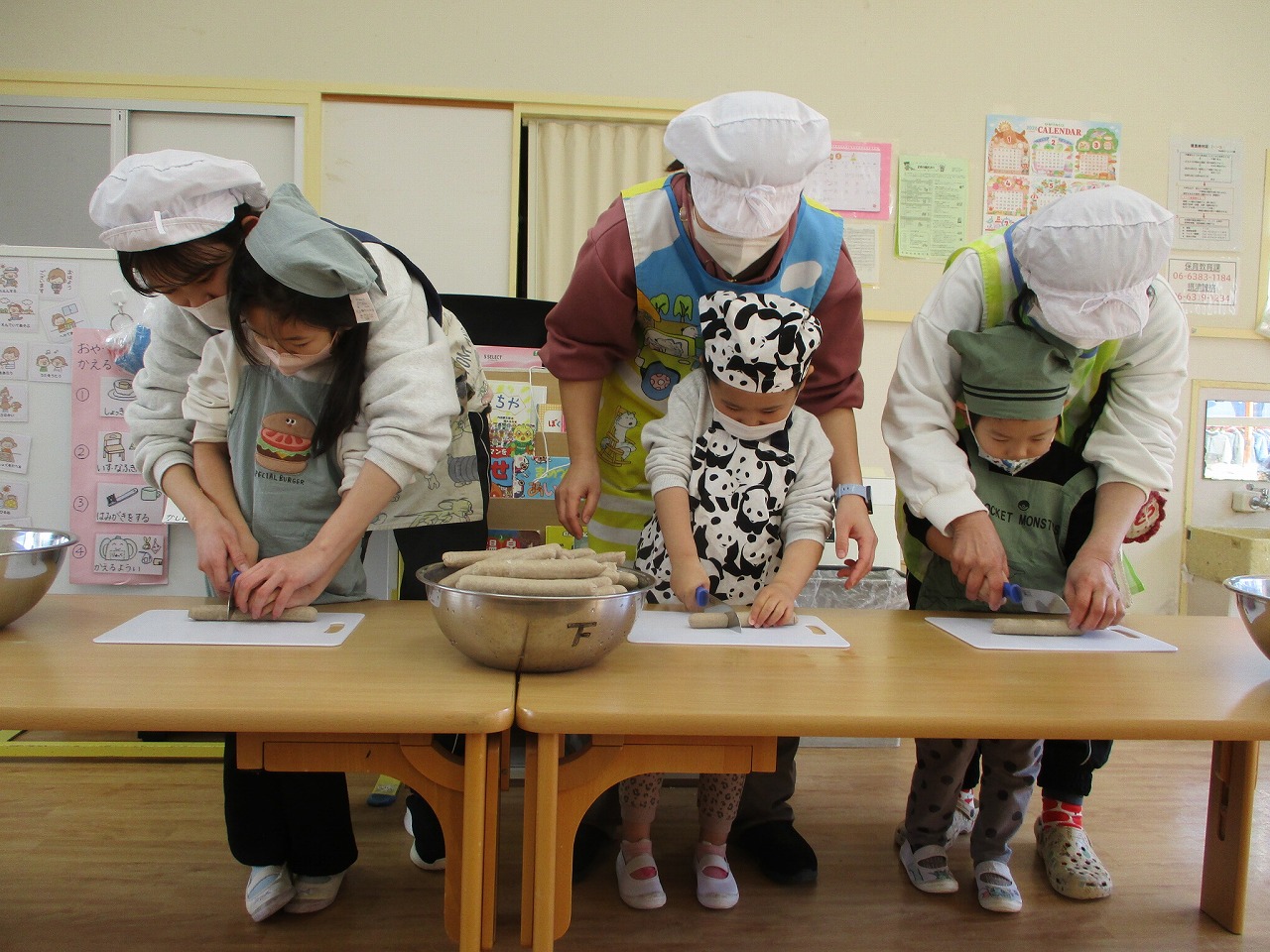 フランクフルトを包丁で切ってフランクフルト屋さんの準備をしているちゅうりっぷ組さんです