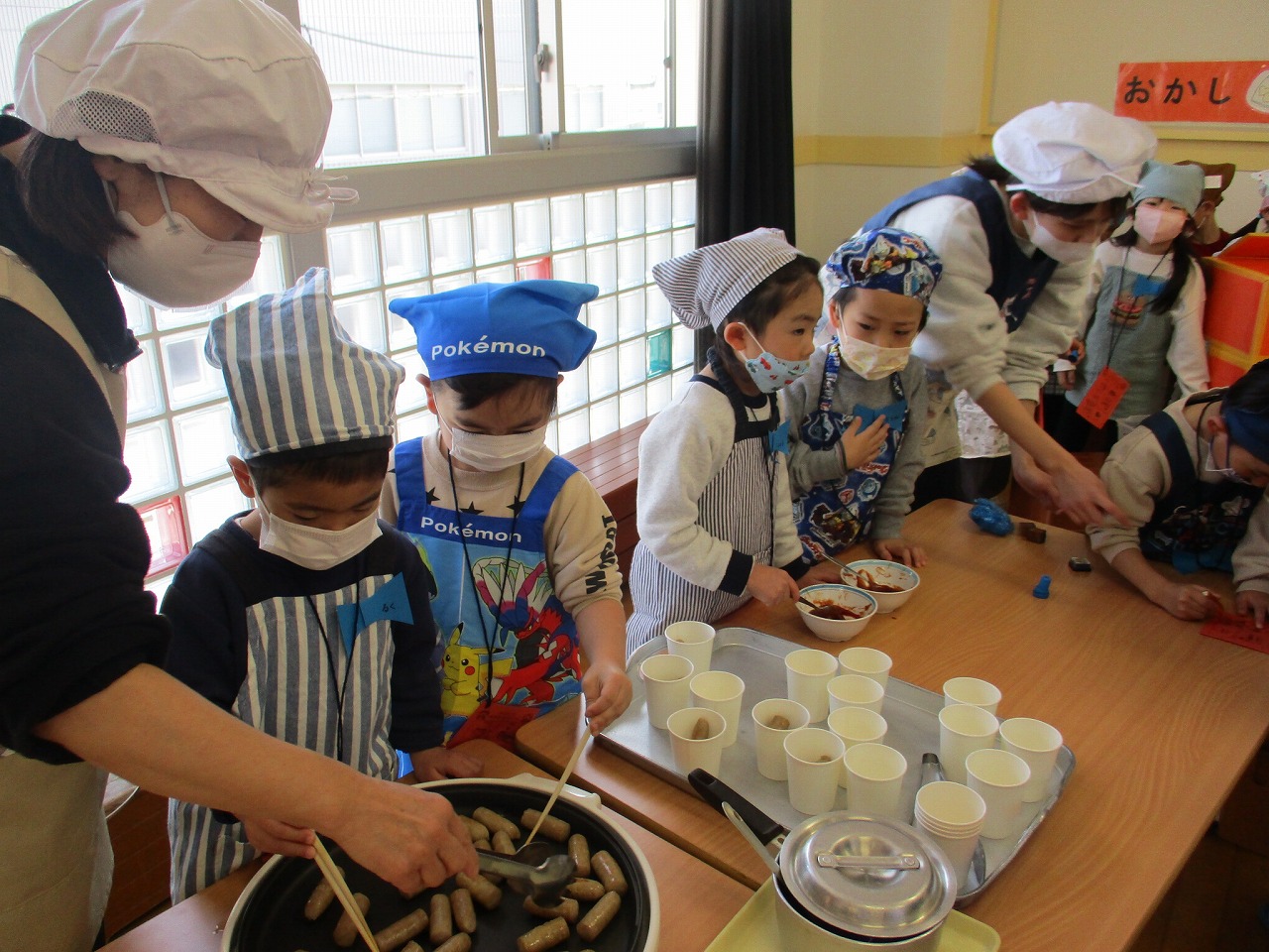 ちゅうりっぷ組の子どもたちがフランクフルトをホットプレートでコロコロ転がし焼きめをつけて「ケチャップいりますか?」とやり取りしています