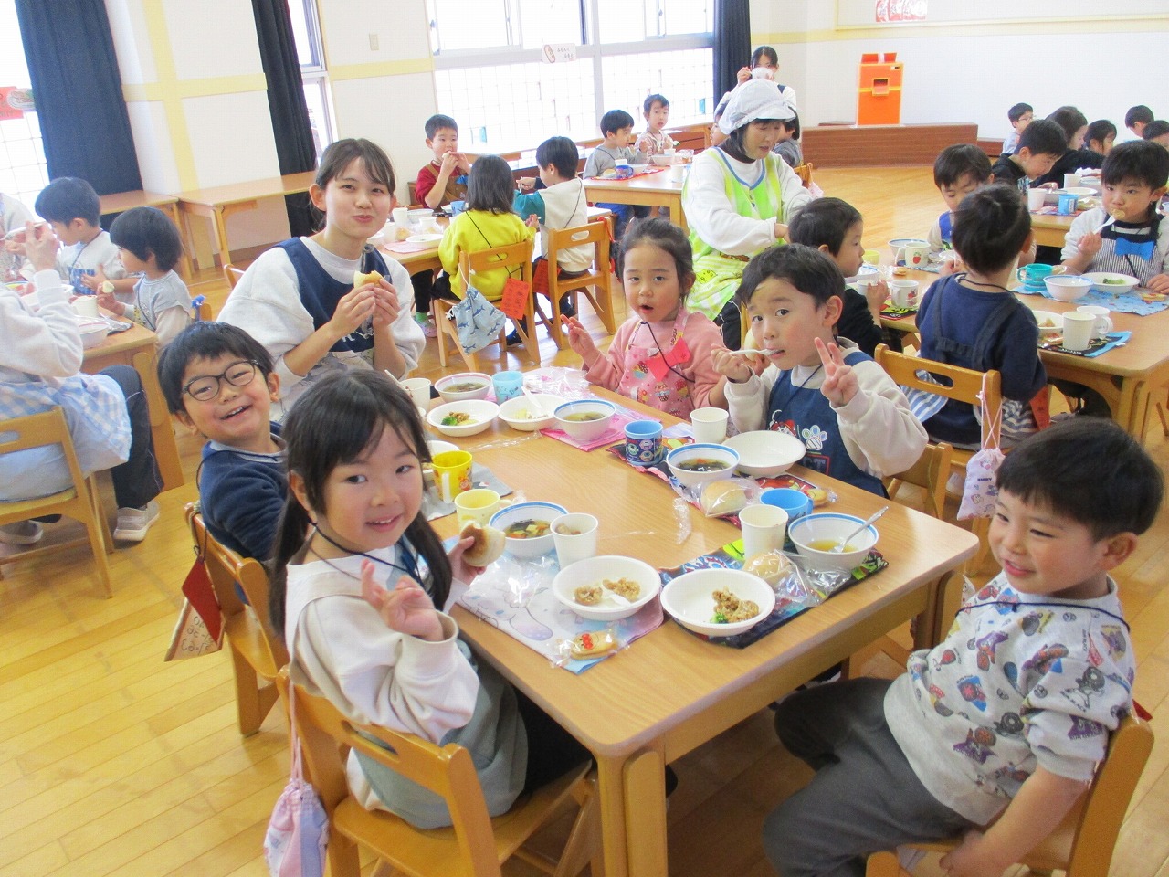 最後は3人の先生扮する鬼さんたちと各クラス集合写真を撮り、給食では手巻き寿司やつみれ汁を食べ、今年1年、元気に楽しく過ごせますように。。と願いました