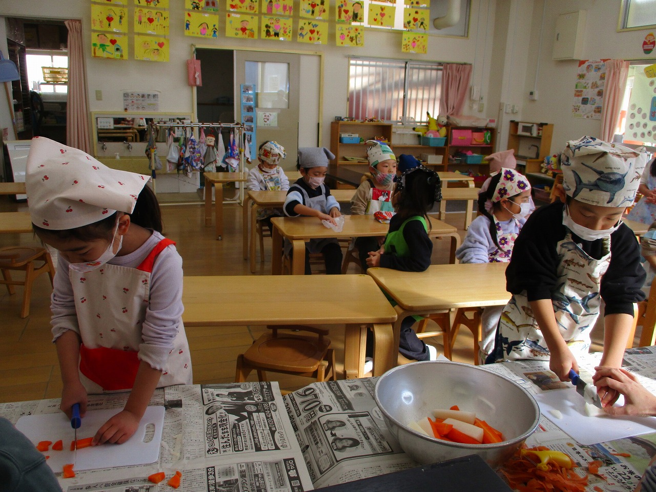 包丁で人参や大根を切ってお味噌汁の準備するさくら組の子どもたちです