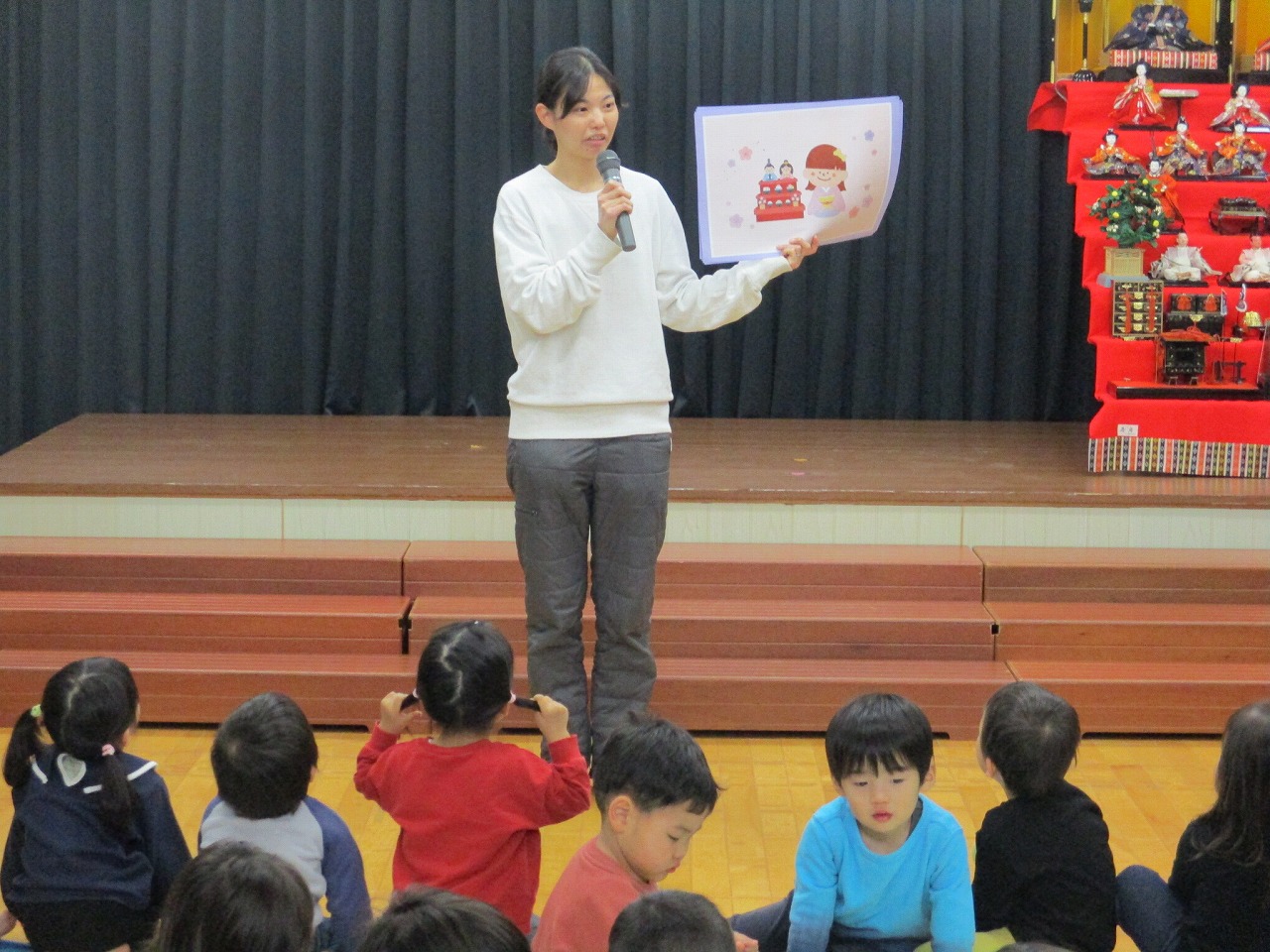 ひなまつりの由来について絵を見ながら教えてもらいました。