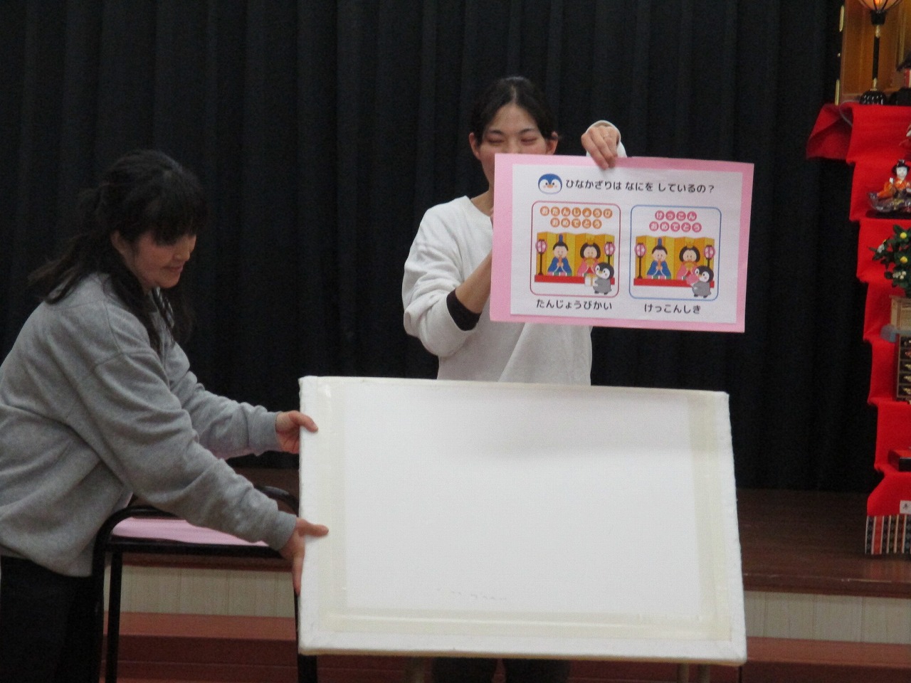 みんなでひなまつりの手遊びや、「うれしいおひなさまの」の歌をうたったり、ひなまつりの由来を聞いたり・・・ひなまつりにまつわるクイズにも挑戦しましたよ。
