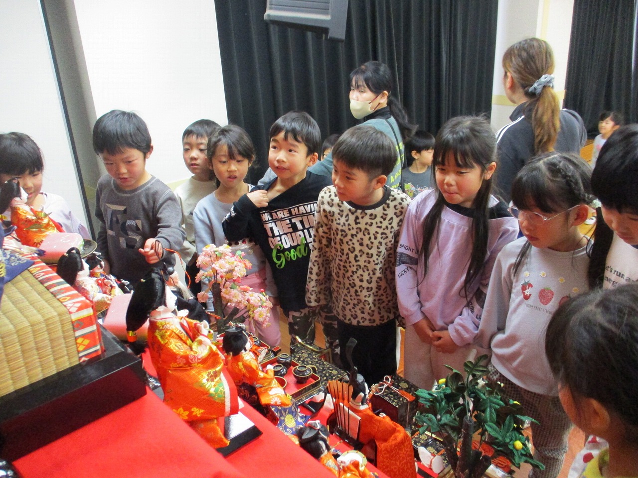 最後は7段飾りのおひなさまの近くまで来て、「これ何?」「このお人形何か顔赤いで」など興味津々のこどもたち。