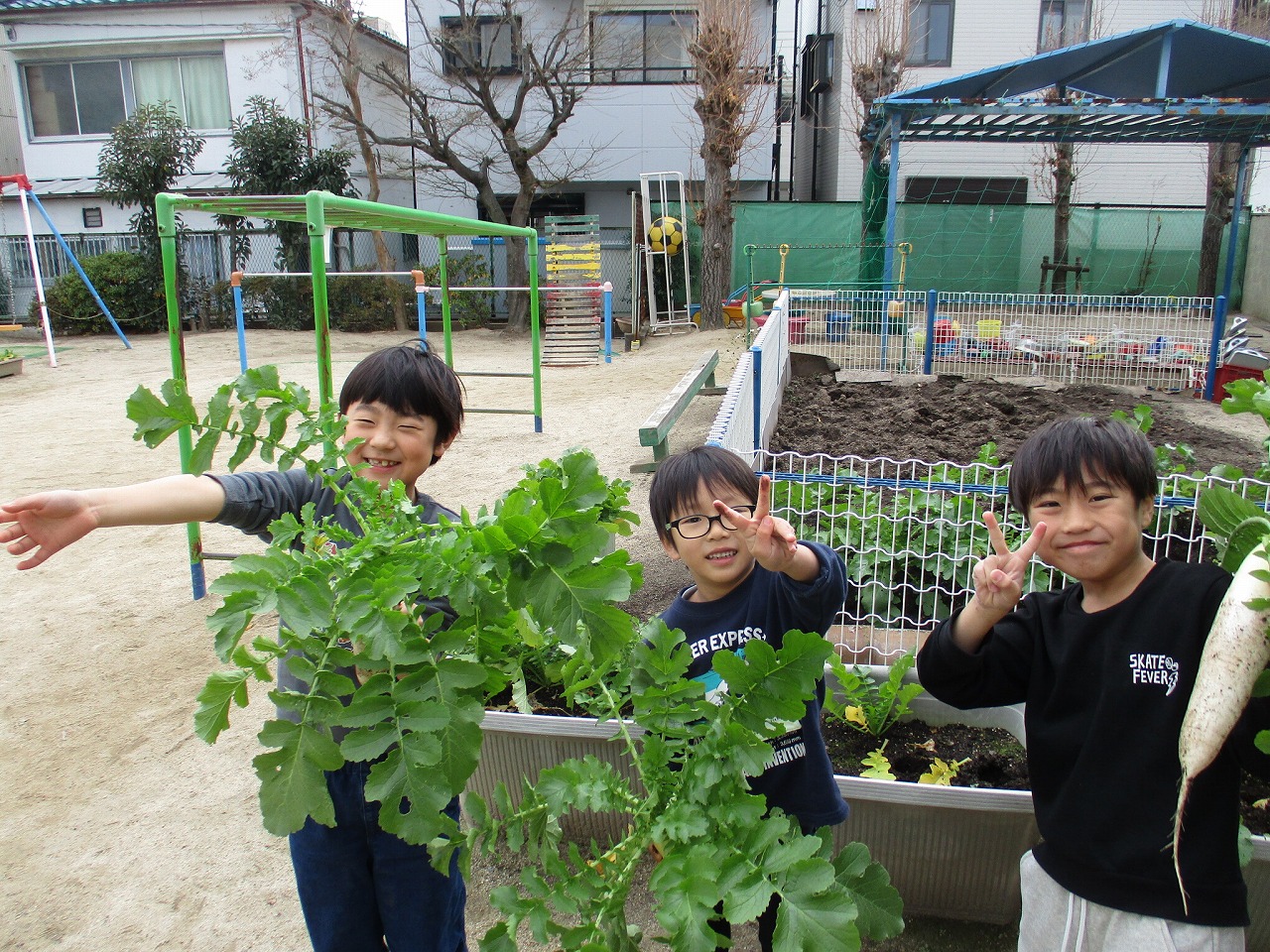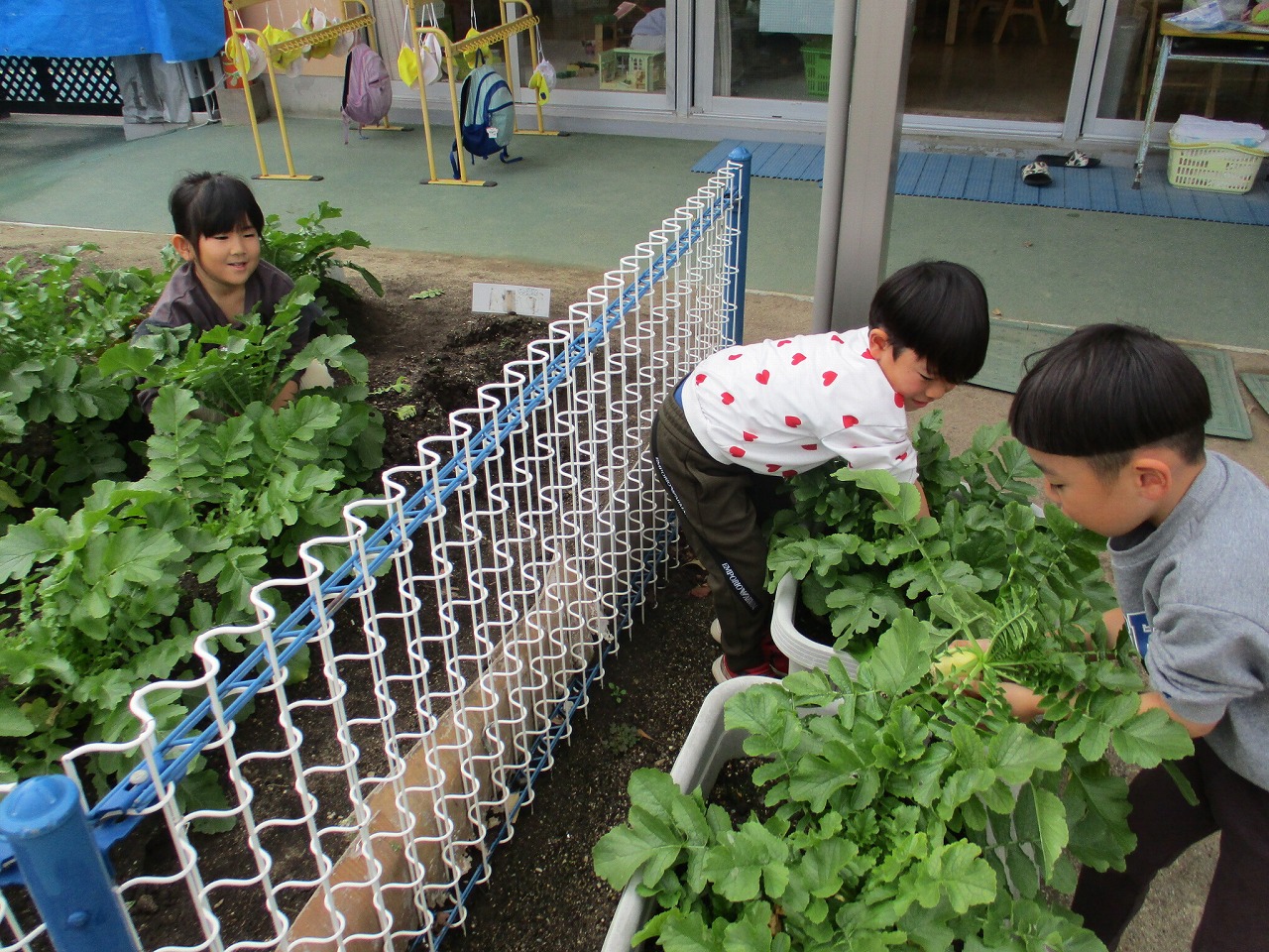 園の畑で育てていた大根が大きくなり収穫の時を迎えました。