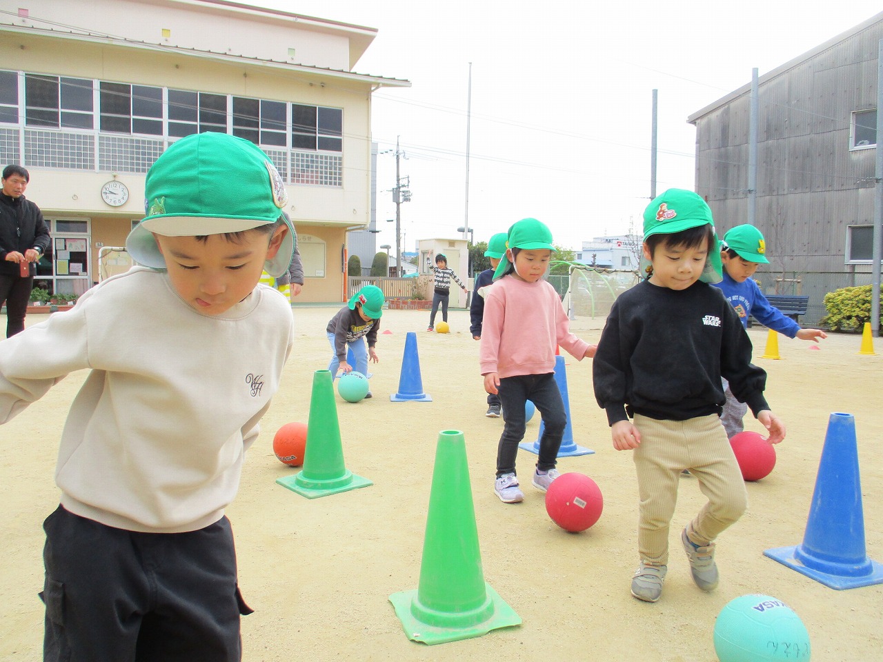 ボールを蹴って進み、戻ってきた友だちとじゃんけんをするゲームでドリブルが上手になりました。