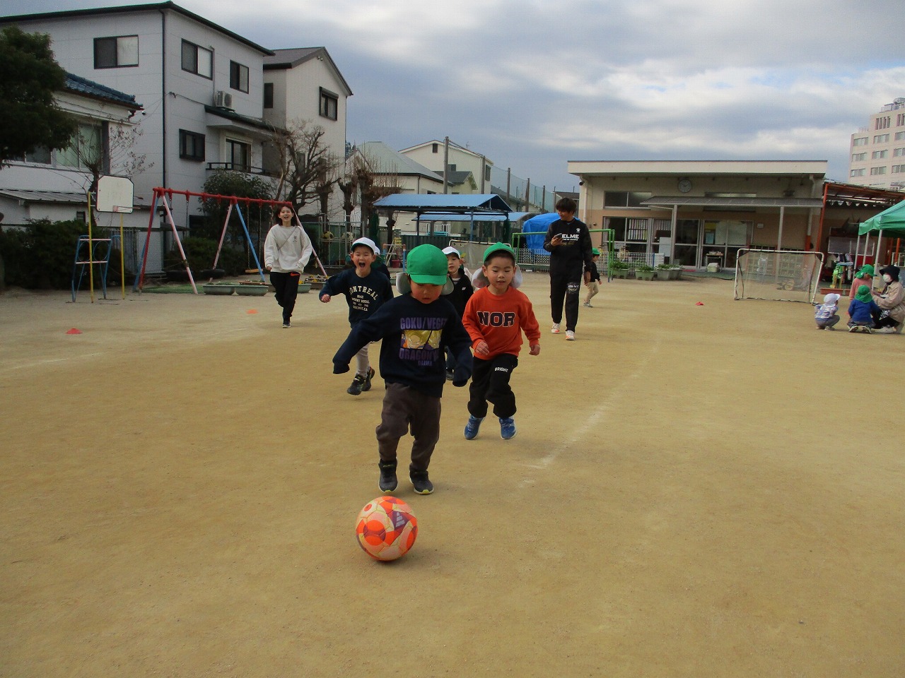 ドリブルをしながらコーチと鬼ごっこをするなど楽しみながらボールを蹴って、最後はサッカーのゲームして楽しみました。