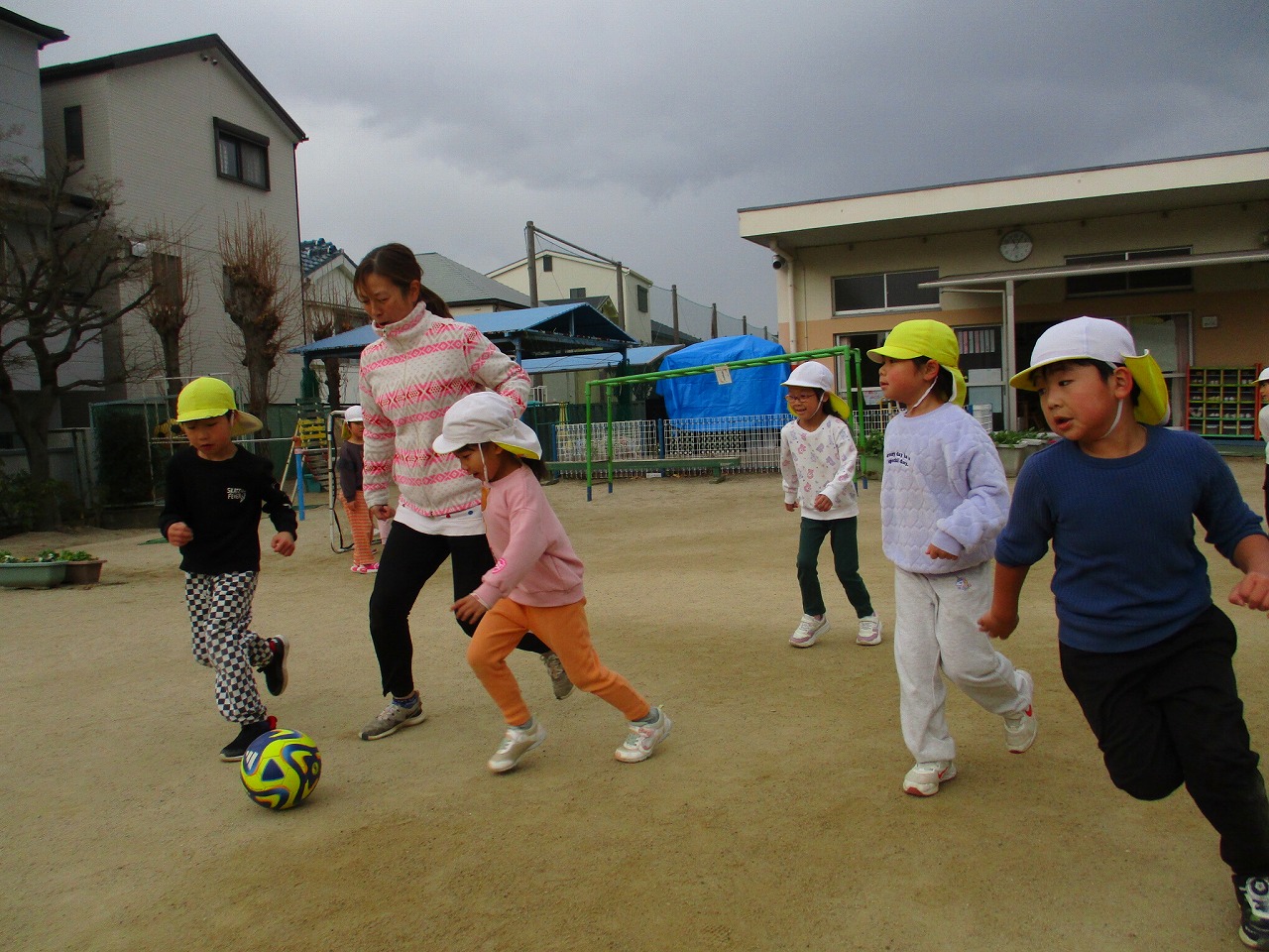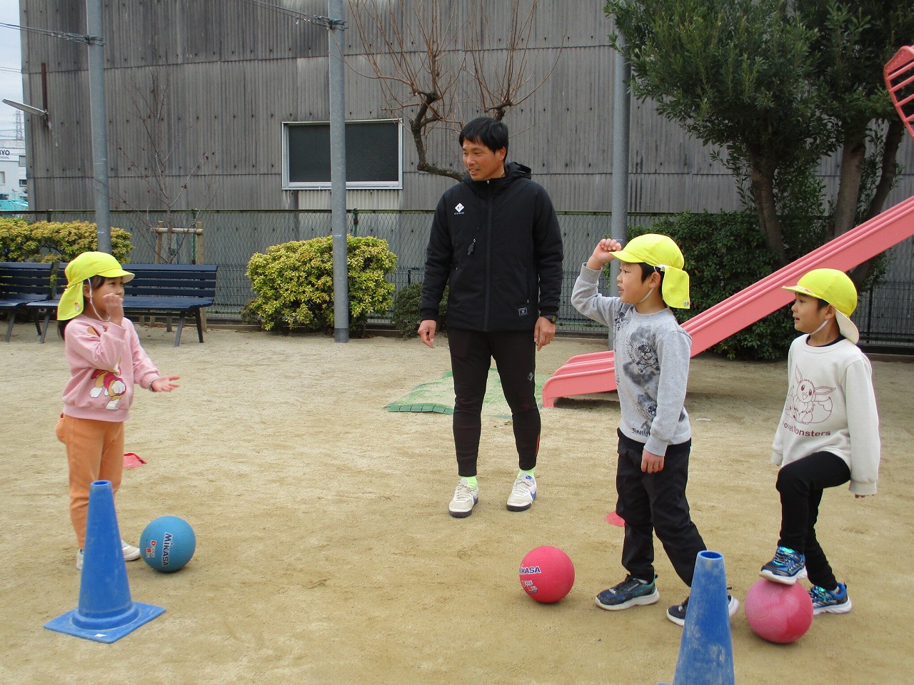 今回は4,5歳児クラスにサッカーのコーチを迎えて、遊びながらサッカーを楽しみました。