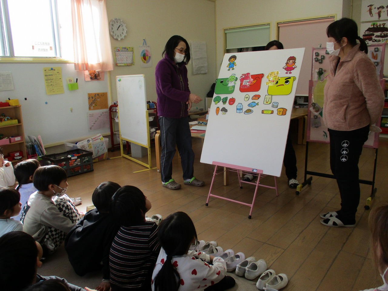 パネルシアターでバランス良く食べることの大切さを教えてもらいました。また、今日の給食の食材を分類分けした時には、今までの三食栄養の話もしっかり覚えており、先生の質問に「あかー」「みどりん」等子どもたちから自信をもった返事が返ってきていました。