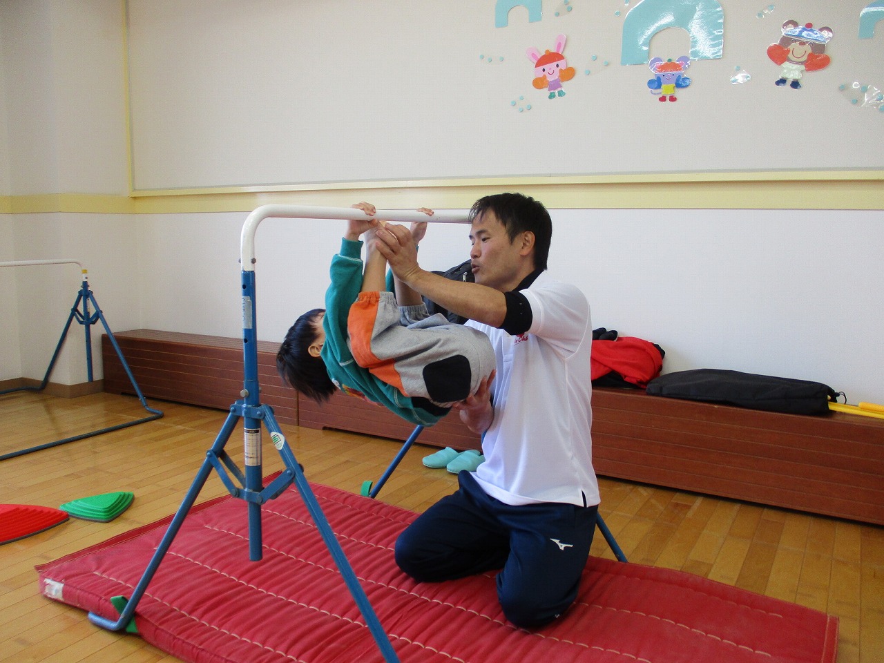 鉄棒をしっかり握って足を棒にチョンとつけることにも挑戦しました。