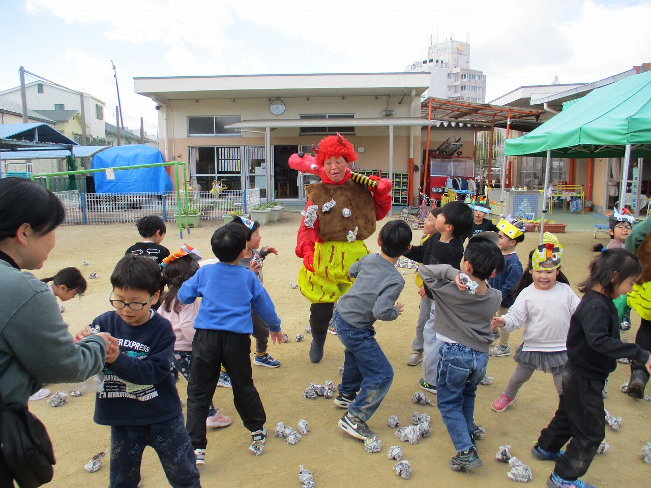 ついに先生扮する鬼が登場!小さい組さんは怖がりながらも新聞紙豆を可愛く投げ、幼児の子どもたちは先生とわかっているので嬉しそうに新聞紙豆を投げ楽しんでいます。