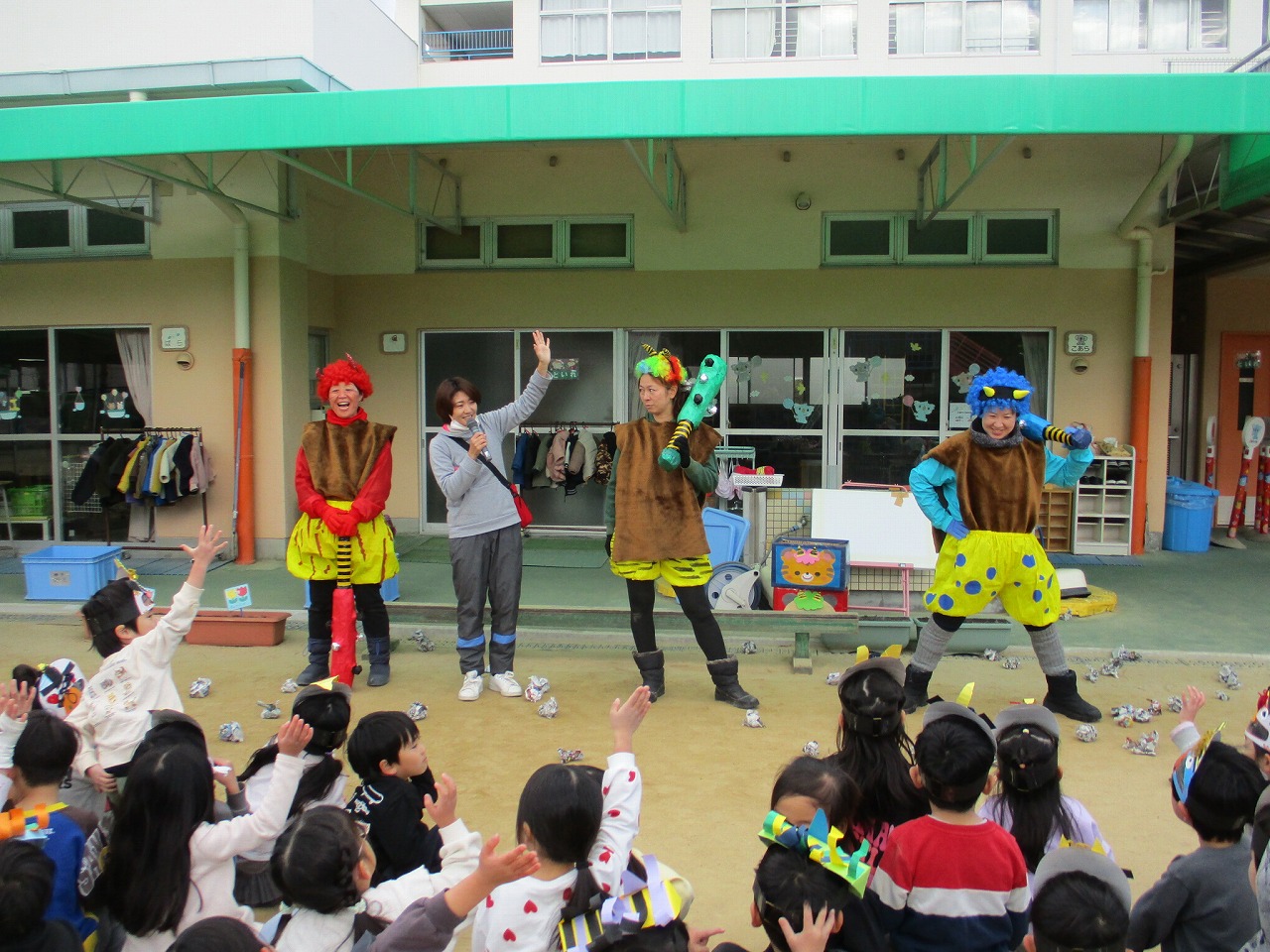 顔は見えていましたが、3人の鬼さんの紹介もしました。赤鬼、青鬼、虹色鬼、「誰先生かな?」とみんな大喜びでした。