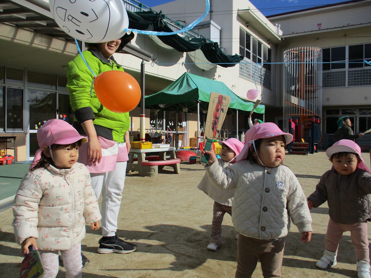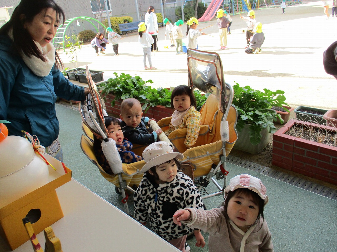 0歳児クラスは歩いたり、バギーに乗ったりして園内を散歩し、お正月の雰囲気を楽しみました。