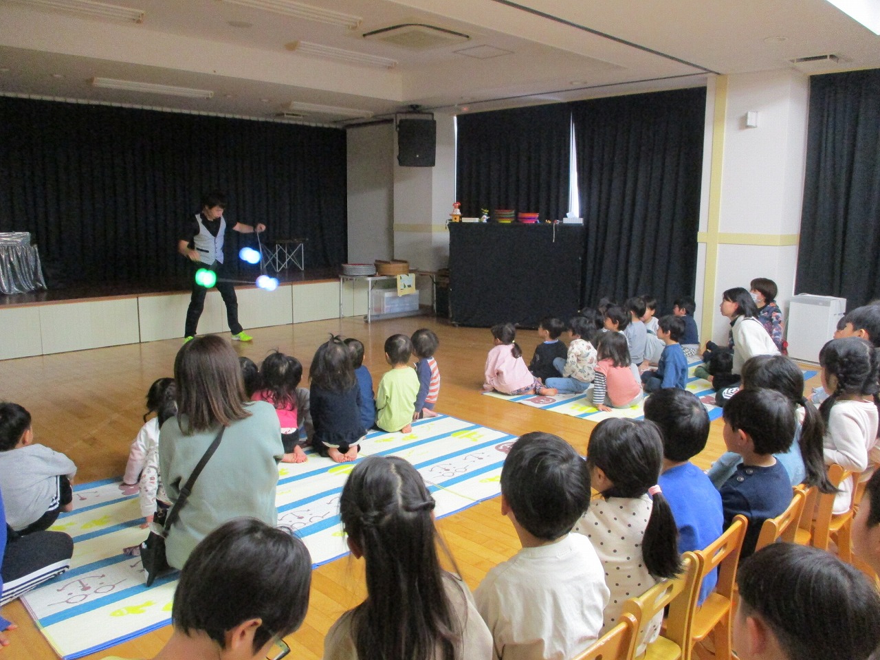 ジャグリングや中国ゴマも見せてくれました。少し照明を落とし、光る中国ゴマが回る様子に見入っている子どもたちでした。