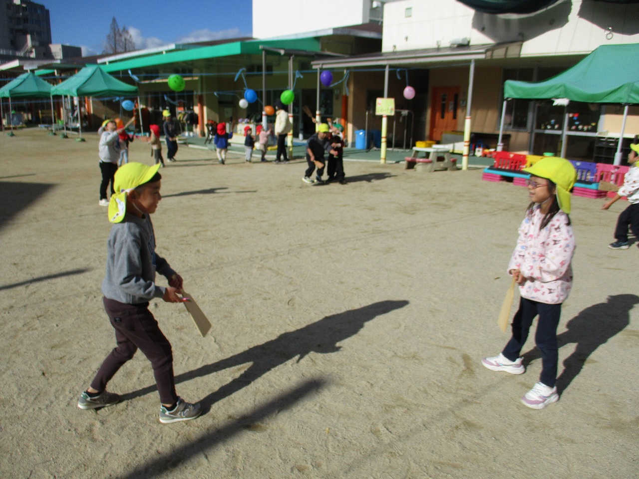 5歳児クラスの子の中には2人でペアになって羽根つきに挑戦している姿もありました。