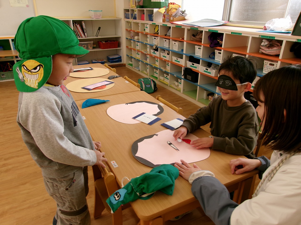 「上!」「右!」等まわりから声を掛けてもらって顔のパーツを置いていきます。目隠しをとって面白い顔の仕上がりに大笑いする子どもたちでした。