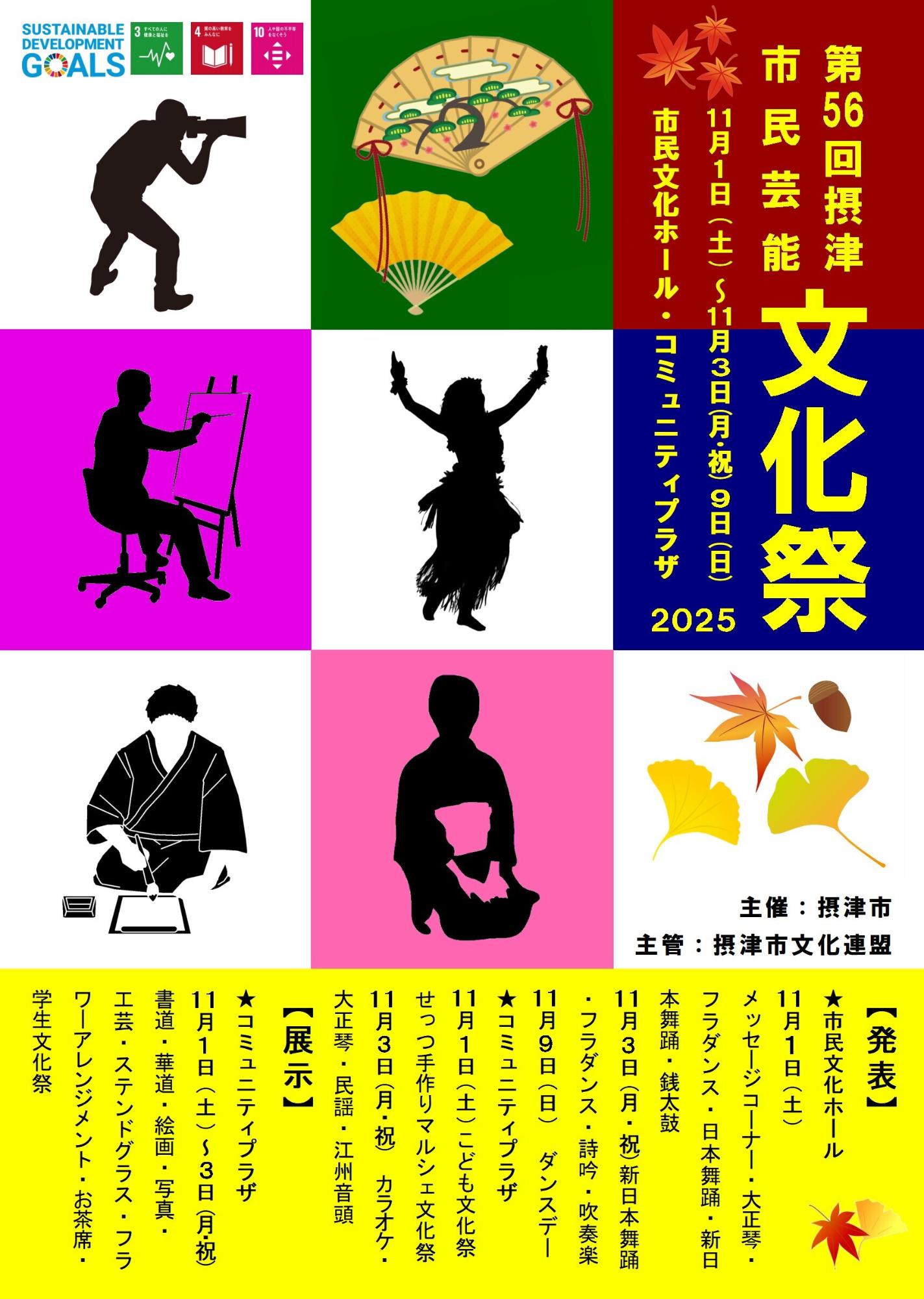 11月1日(土曜日)~3日(月曜日・祝日)・9日(日曜日)に、文化ホール・コミュニティプラザの各会場にて、第56回摂津市民芸能文化祭を開催します!