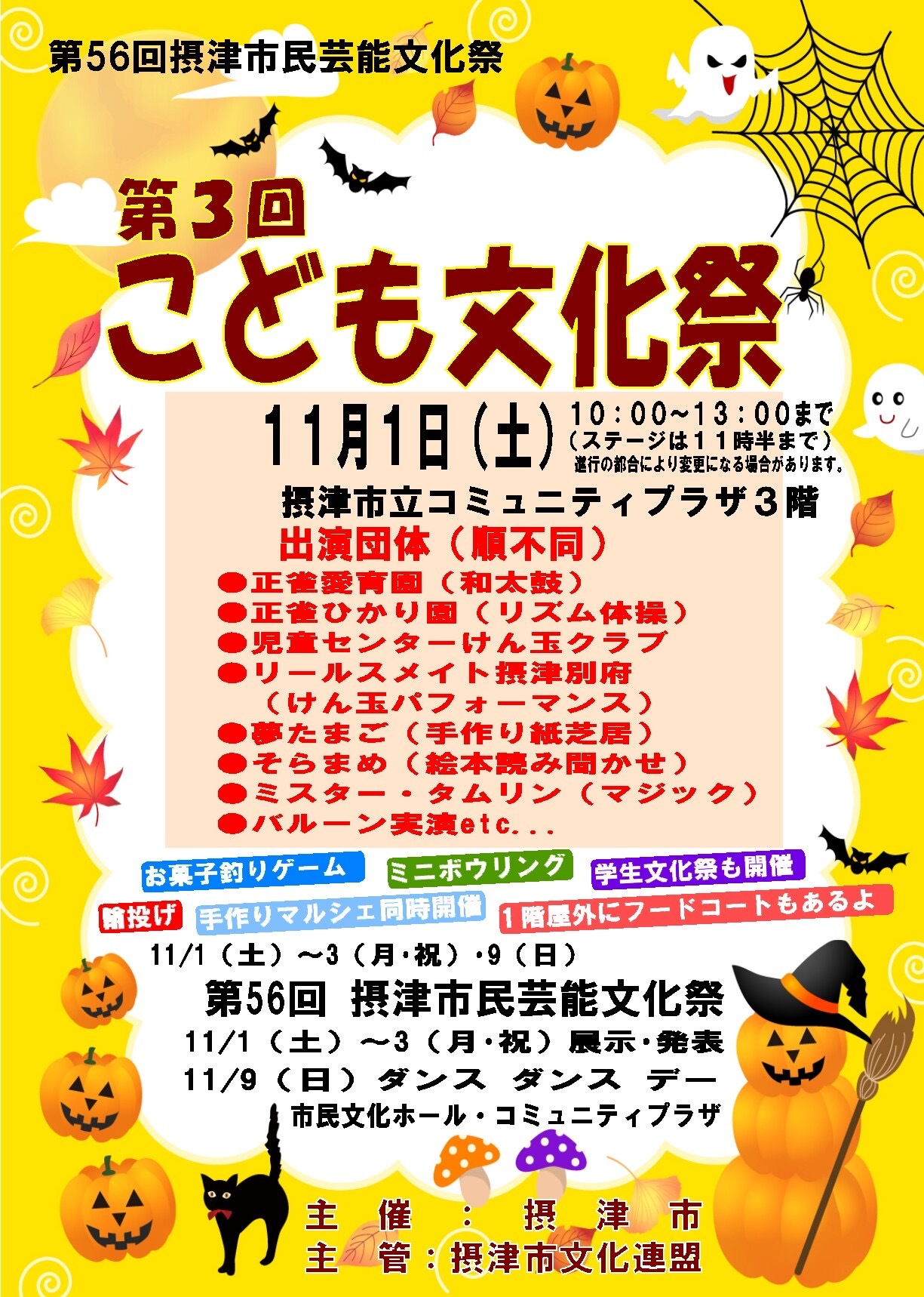子どもたちによる舞台発表や紙芝居などが楽しめる「こども文化祭」、摂津市内の学生の個性あふれる展示作品が集まる「GAKUSEI文化祭」、手作り雑貨やアクセサリー、ワークショップもある「せっつ手作りマルシェ文化祭」「フードコート」と盛りだくさんの内容でみなさまのご来場を心からお待ちしています!