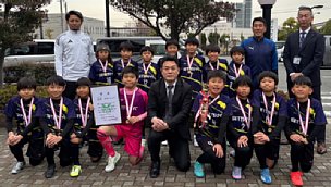 摂津FCの皆さんが1月11・12日に開催されました「スポーツ少年大会サッカー競技の部」において優勝を果たされたご報告のため、優勝トロフィーを持って市役所を訪問してくださいました。