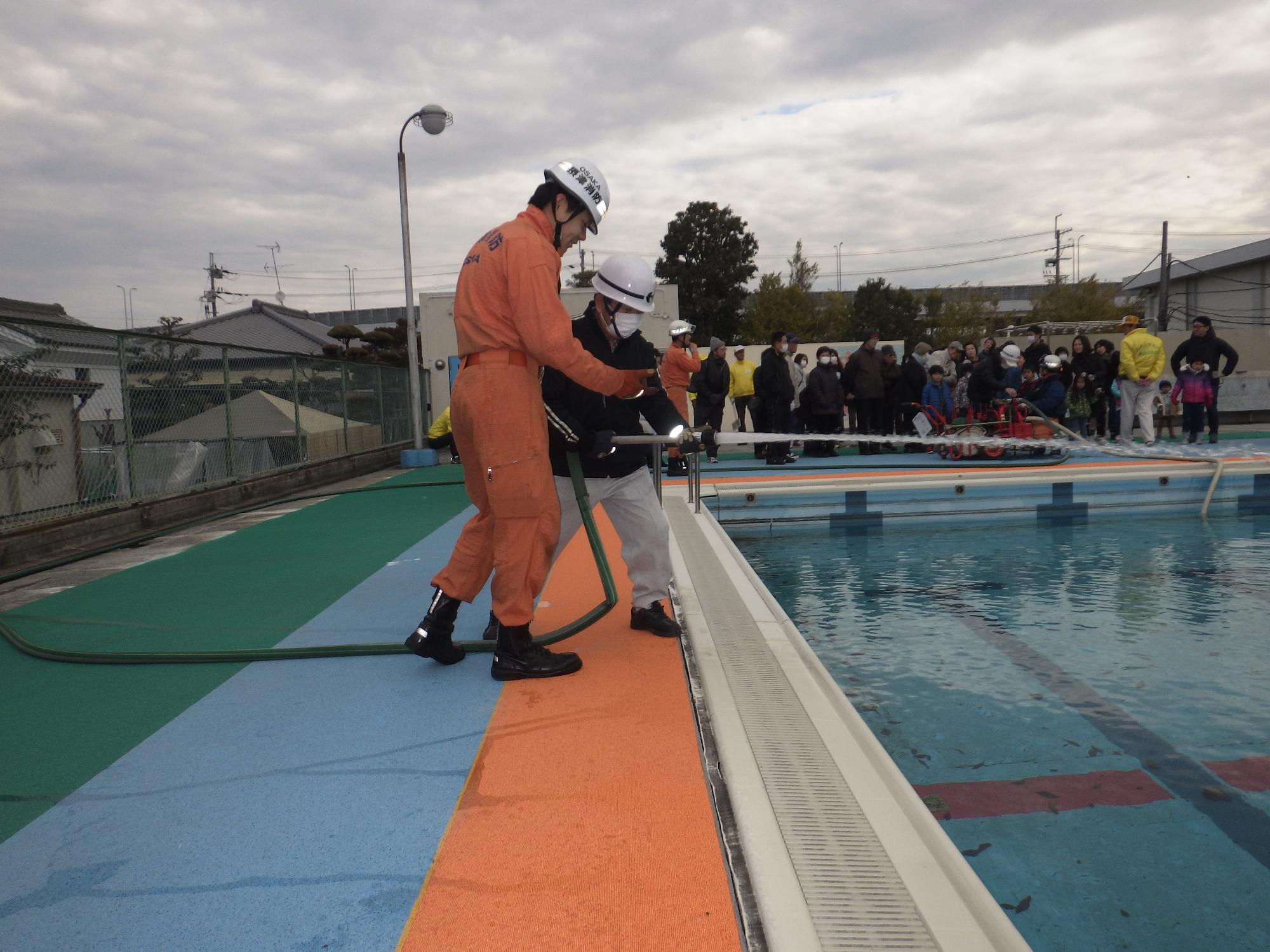 放水体験!軽可搬式消防ポンプでプールの水を吸い上げて、放水訓練をします!