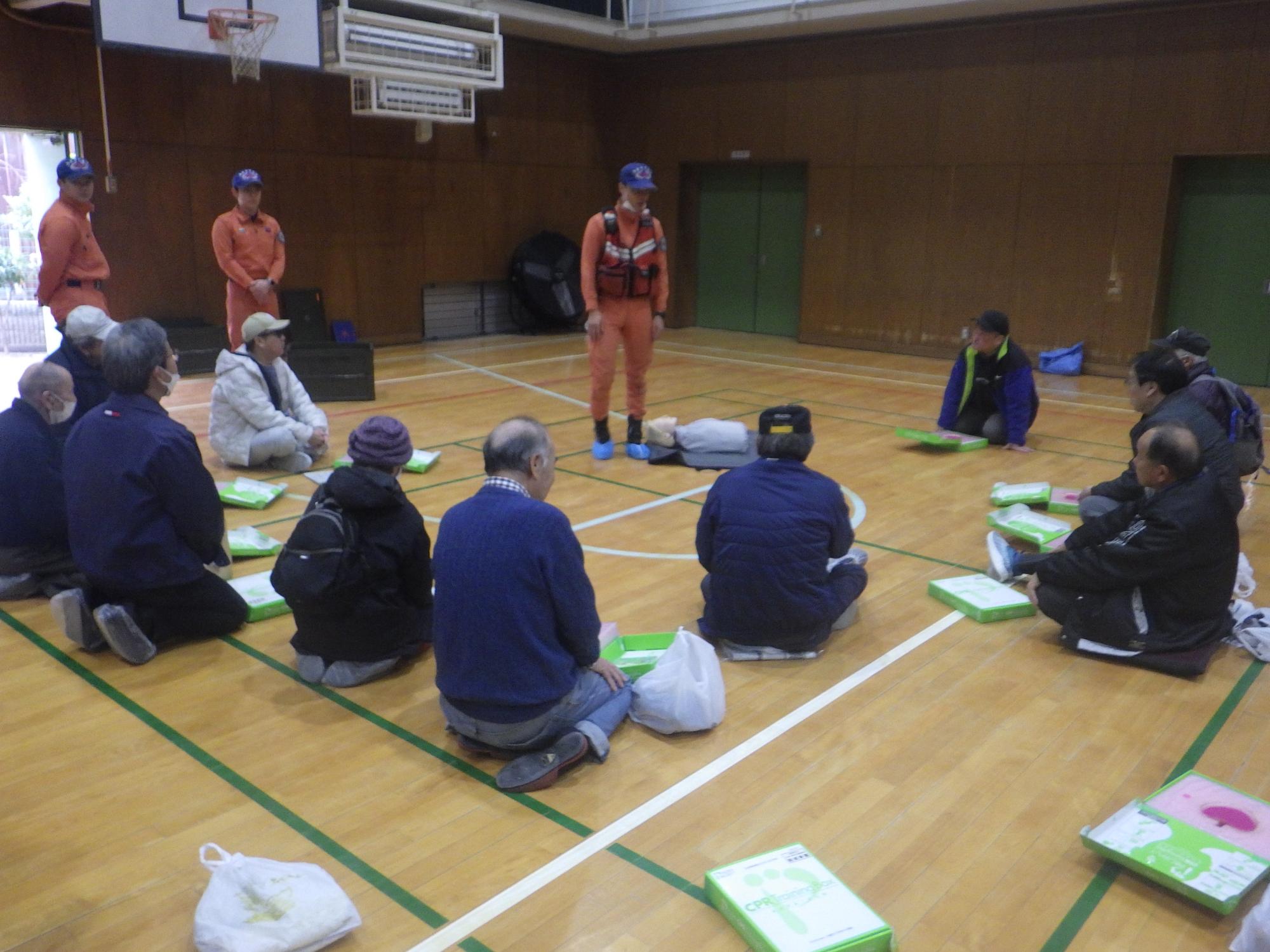 ・胸骨圧迫の訓練を行いました。皆さん一生懸命取り組んでくれました。