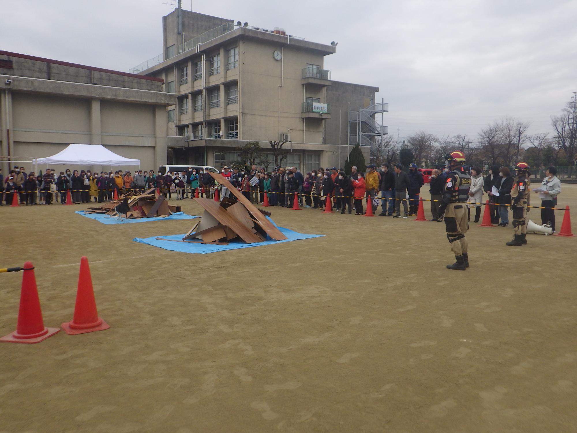 ・日本レスキュー協会と人命救助訓練を行いました。倒壊した建物から要救助者を救出するという想定です。