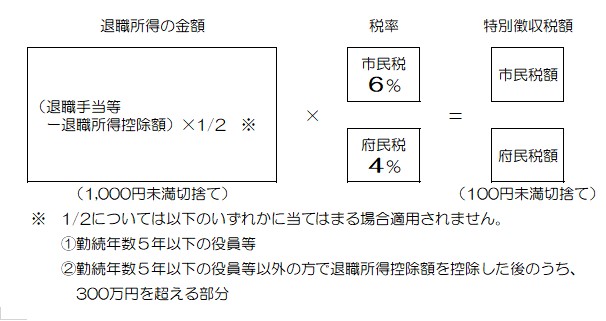 退職所得に対する市民税・府民税所得割(分離課税)の納入については、所得税と同じように、退職手当を支給するとき、その退職手当の額により市民税・府民税額を計算し、特別徴収していただくことになります。